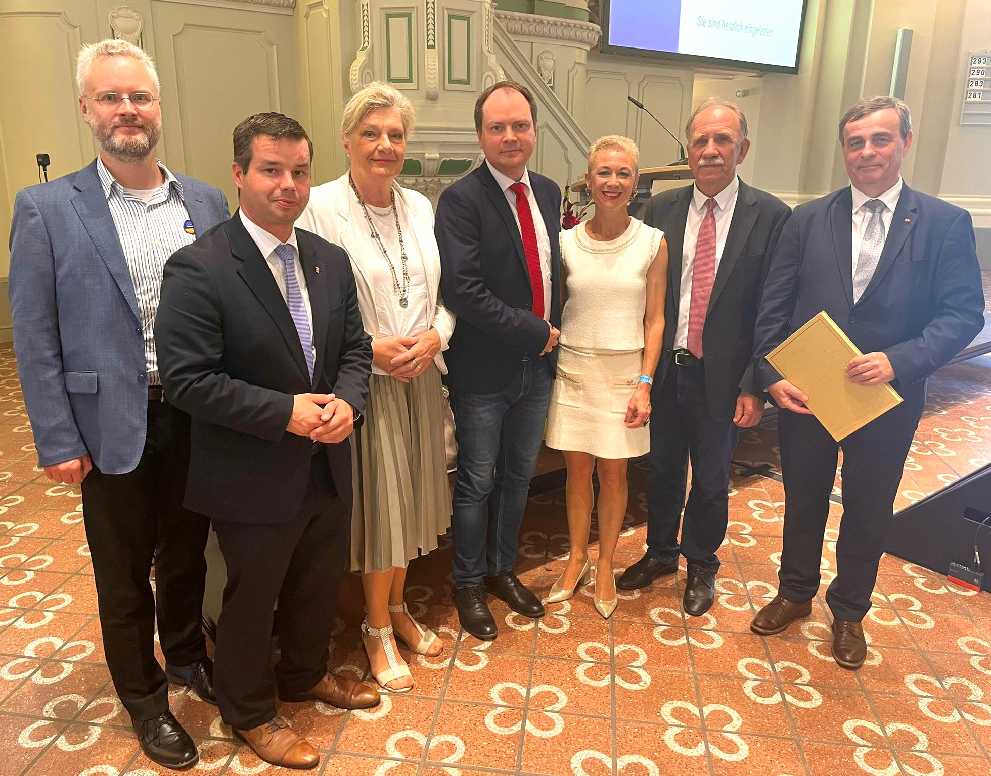 Festredner des Tages war der ehemalige Stadtpräsident von Breslau (2002-2018) Dr. Rafael Dutkiewicz, der mit seinen Ausführungen beeindruckte. Er rief in Erinnerung, Breslau sei die einzige europäische Stadt, deren Bevölkerung nach dem Zweiten Weltkrieg komplett ausgetauscht wurde. Alle deutschen Bewohner seien nach 1945 vertrieben worden. Breslau sei die Stadt der Vertreibungen und Versöhnungen. Heute sei die Stadt erneut eine Stadt der Vertreibung, sie habe Hunderttausende ukrainische Flüchtlinge aufgenommen. Europäisch sein – aus Vertreibung zu Versöhnung zu gelangen, das sei die Aufgabe. Russland sei unser gemeinsames Problem. Die Ukraine habe das Recht und die Pflicht, sich gegen Russlands Angriffskrieg zu verteidigen. Wir seien dazu verpflichtet, der Ukraine zu helfen, auch mit Waffenlieferungen. Eine Nation könne sich heute nur international verwirklichen.
