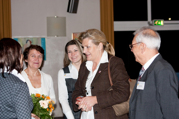 Foto: Landesbeauftragte Margarete Ziegler-Raschdorf (2.v.r.) nach ihrem Grußwort im Gespräch mit Frau Natalia Wagner (links), Frau Lilia Dejak (2.v.l.), Frau Swetlana Wagner (3.v.l.) und Herrn Erwin Vetter (rechts).Die Landesbeauftragte dankte allen Beteiligten für die Vorbereitung, Organisation und Durchführung der Kulturwoche, die ein attraktives und abwechslungsreiches Programm vorsehe. Diese Veranstaltungsreihe soll die Kommunikation und die Begegnungsmöglichkeiten zwischen Spätaussiedlern und den einheimischen Bürgern fördern. „Integration statt Isolation“ sei der lobenswerte Leitgedanke, der über die Kulturwoche hinaus Geltung haben sollte. Nur wenn man aufeinander zugehe, sei man in der Lage, die Probleme des jeweils anderen zu verstehen.
