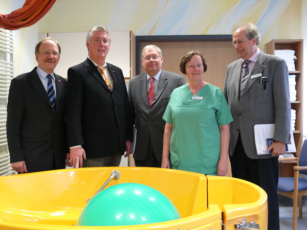 Höhepunkt war dann der offizielle Besichtigungstermin der Kreissäle, und die Herren posierten gerne mit Str. Erna Kunz-Meiri vor der Geburtswanne.