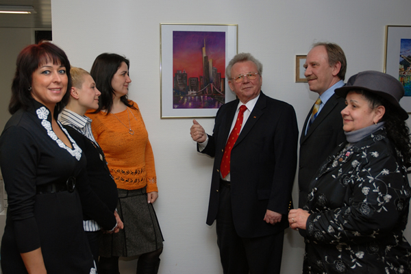 Der Landesbeauftragte zeigt seinen Gästen vor seinem Büro die Bilder russlanddeutscher Künstler v.l. Natalia Wagner, Albina Nazarenus-Vetter, Svetlana Ivkin, Landesbeauftragter Rudolf Friedrich, Johann Thießen und Svetlana PaschenkoRudolf Friedrich zitierte aus dem Koalitionsvertrag zwischen CDU und FDP, wonach „ wir erneut einen Landesbeauftragten für Heimatvertriebene und Spätaussiedler berufen, den Landesvertriebenenbeirat weiter unterstützen und die Patenschaften des Landes weiter stärken werden“. Für die Verbände sei außerdem wichtig, dass die Aufgaben der Heimatvertriebenen und Spätaussiedler wie bisher im Aufgabenbereich des Hessischen Ministeriums für Arbeit, Familie und Gesundheit bleiben werden und Herr Staatsminister Jürgen Banzer ihm bereits signalisiert habe, dass er sich dieser neuen Aufgabe engagiert annehmen werde.