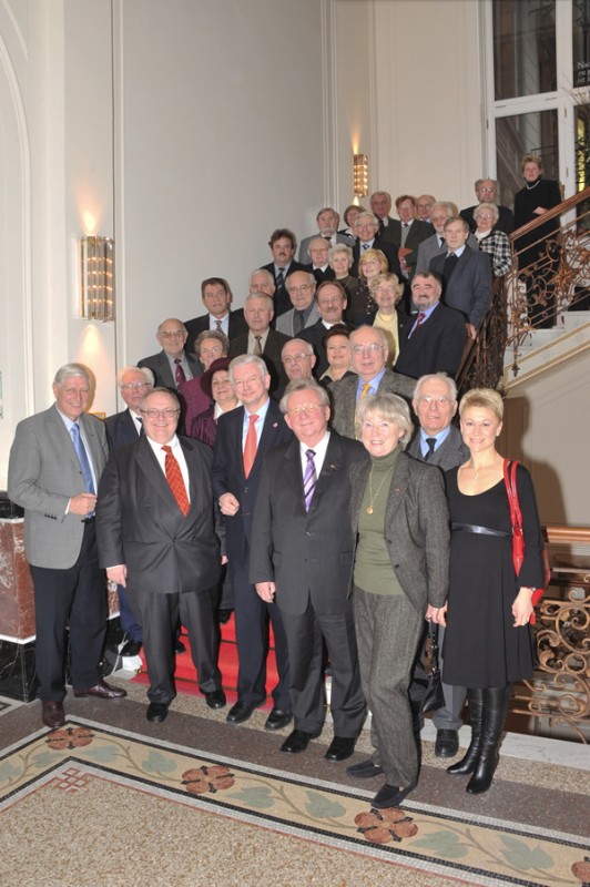 Foto: e.blatt | Die Spitzen der Vertriebenenverbände und Landsmannschaften mit dem Ministerpräsidenten: 1. Reihe v.l.: Stellvertretender BdV-Landesvorsitzender Hartmut Saenger, Staatsminister Jürgen Banzer, Ministerpräsident Roland Koch und LandesbeauftraMinisterpräsident Roland Koch begrüßte die Vertreter der Heimatvertriebenen und Spätaussiedler und nannte es eine gute und sorgfältig gepflegte Tradition, sich zu Beginn des Jahres in diesem Kreis zu treffen. Die guten Kontakte zwischen den Verbänden und der Landesregierung würden durch diese Veranstaltung öffentlich sichtbar. Er sei stolz darauf, eine solche Basis der Gemeinschaft gefunden zu haben und nannte es als gemeinsames Ziel, etwas für die Zukunft gestalten zu wollen.