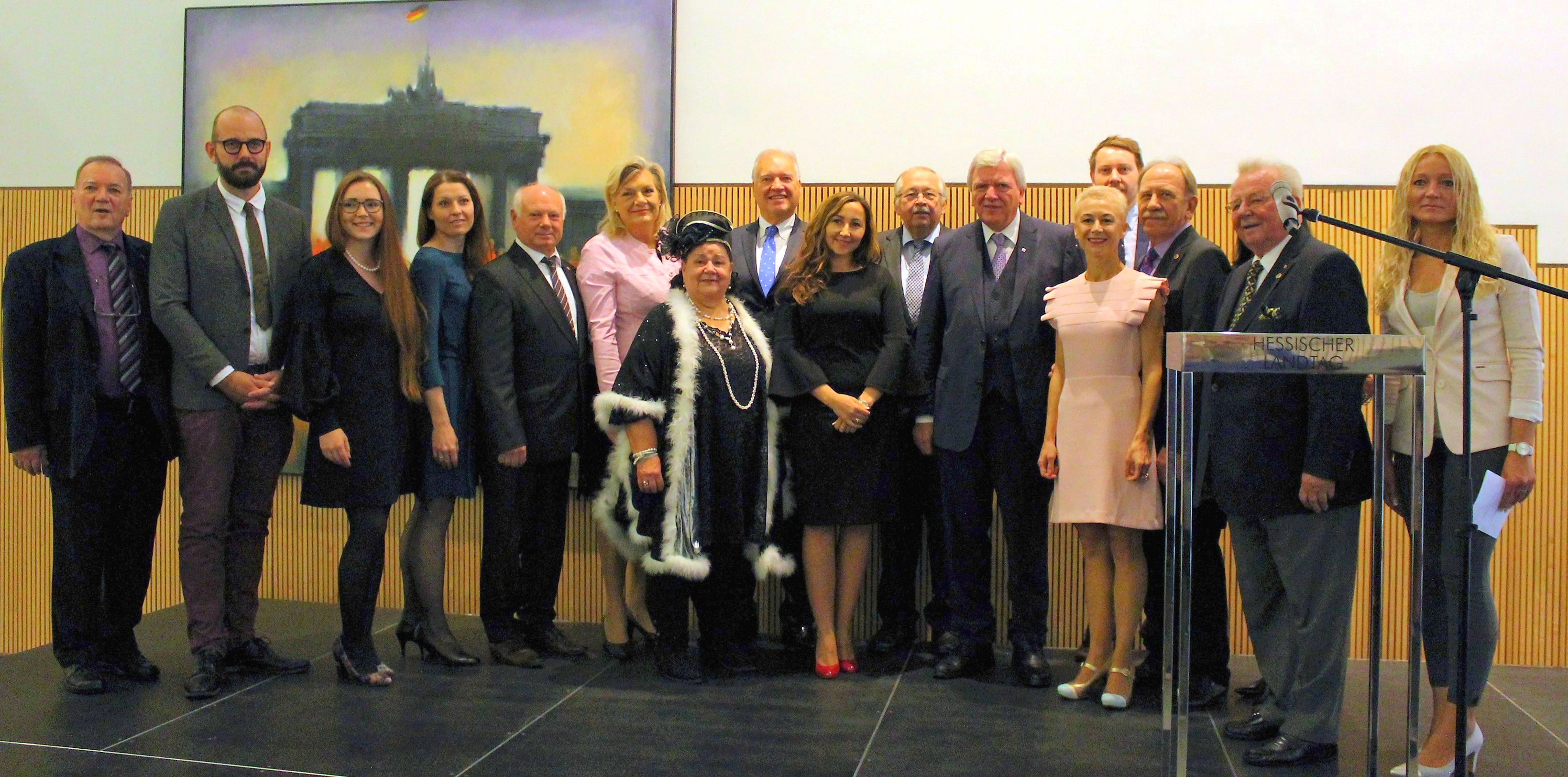 Zu Beginn der Festveranstaltung im Foyer des Hessischen Landtags hatte die Geschäftsführerin der Deutschen Jugend aus Russland (DJR), Albina Nazarenus-Vetter, in ihrer Begrüßungsansprache dem Ministerpräsidenten dafür gedankt, dass sich die hessische Landesregierung des Themas „100 Jahre deutsche Autonomie an der Wolga“ angenommen habe und er selbst bereit gewesen sei, die Schirmherrschaft über die Festveranstaltung im Hessischen Landtag zu übernehmen. Nach ihrer Begrüßung der rund 300 Gäste, unter denen sich u. a. neben dem Ministerpräsidenten und Landtagspräsident Norbert Kartmann, auch die Landesbeauftragte für Heimatvertriebene und Spätaussiedler, Margarete Ziegler-Raschdorf, ihr Vorgänger im Amt Rudolf Friedrich, der Landtagsabgeordnete und Vorsitzende der Union der Vertriebenen (UdV), Ulrich Caspar sowie der Kulturreferent der Bundesregierung für die Russlanddeutschen, Edwin Warkentin sowie die Vorsitzenden der Landsmannschaft der Deutschen aus Russland aus Nordrhein-Westfalen und Bayern befanden, wurden diese noch einmal durch Landtagspräsident Norbert Kartmann, dessen familiäre Wurzeln in Siebenbürgen liegen, in seiner Funktion als Hausherr herzlich willkommen geheißen. Er wies darauf hin, dass die Wolgadeutschen sich nach ihrer „Rückkehr“ aufgrund ihrer Verwurzelung in zwei Ländern in einer besonderen Situation befänden.