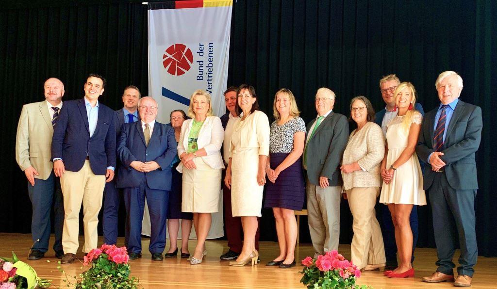 Landesbeauftragte M. Ziegler-Raschdorf (Mitte, 6. von links) mit Ehrengästen und dem Vorsitzenden Frank Dittrich (links) sowie dem stellvertr. Vorsitzenden Gerd-Helmut Schäfer (rechts). (FoIn ihrer Festrede erinnerte die Landesbeauftragte daran, dass im September 1948 aus 17 Ortsgruppen die BdV-Kreisgruppe Obertaunus gegründet wurde und im benachbarten Usinger Land im Jahr 1950 ebenfalls ein BdV-Kreisverband. Im Zuge der Zusammenlegung der Landkreise Obertaunus und Usingen im Jahr 1972 hätten sich auch die beiden Kreisgruppen zum BdV-Hochtaunus zusammengeschlossen. Die Heimatvertriebenen hätten es nicht leicht gehabt, sich an ihren Ankunftsorten neu einzurichten. In die Häuser der Einheimischen zwangseinquartiert, seien sie alles andere als willkommen gewesen. Im Jahr 1950 machten die 25.404 im heutigen Hochtaunuskreis aufgenommenen Heimatvertriebenen rund 15 Prozent der Bevölkerung aus. Diese gewaltige Zahl sei Anlass, auch im Rahmen des Jubiläums an die größte Vertreibung der Menschheitsgeschichte zu erinnern, denn das bleibe die Aufgabe – jetzt und in Zukunft.