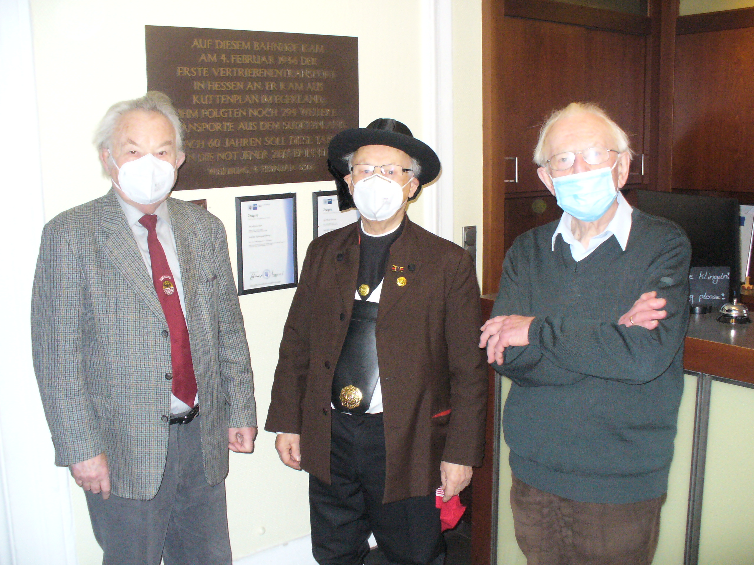 Josef Plahl, BdV-Kreisvorsitzender Limburg-Weilburg; Otto Riedl, Kreisobmann der SL-Limburg-Weilburg in Egerländer Tracht; Werner Richter, Zeitzeuge vor der Gedenktafel zur Erinnerung an die Ankunft des ersten VertriebenentransportesIn den vergangenen Jahren wurde alle fünf Jahre in Weilburg der Ankunft des Vertriebenenzuges mit einer besonderen Gedenkveranstaltung gedacht. Aufgrund der Corona-Pandemie ist dies in diesem Jahr leider nicht möglich. Vertreter des Bundes der Vertriebenen (BdV) im Kreisverband Limburg-Weilburg legten zur Erinnerung auf dem Weilburger Friedhof einen Kranz nieder.