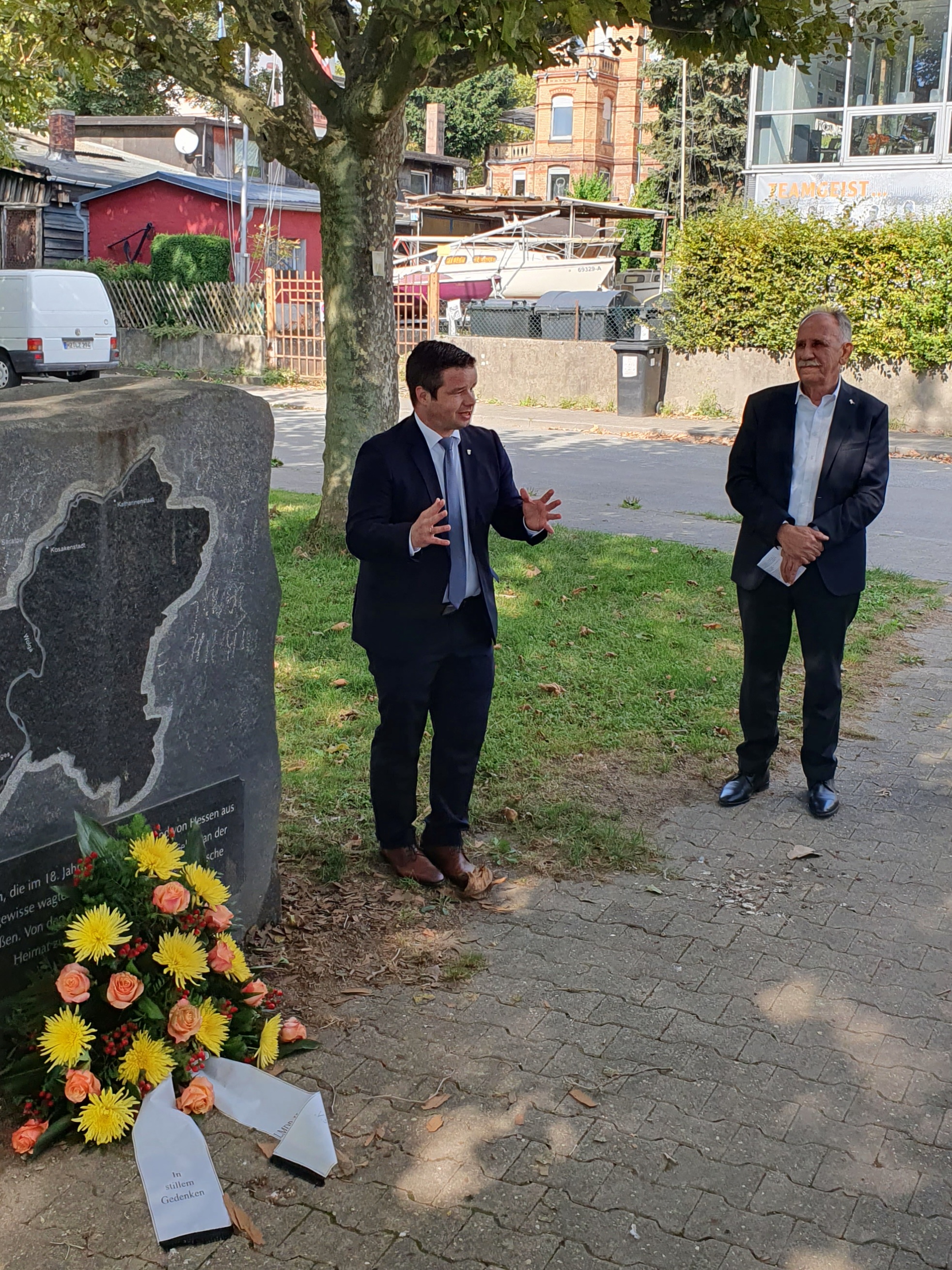 Neben dem Landesbeauftragten nahmen Vertreterinnen und Vertreter der Landmannschaft der Deutschen aus Russland sowie Nachkommen der Wolgadeutschen an der Zeremonie teil, von denen heute wieder viele in Deutschland leben. „Sie tragen die Erinnerung an ihre Vorfahren weiter, die nicht nur Opfer einer grausamen Politik wurden, sondern auch eine starke und stolze Gemeinschaft waren. Ihre Geschichte ist eine Geschichte von Heimatverlust, aber auch von neuer Hoffnung. Von Deportation und Vertreibung, aber auch von Neuanfang und Integration“, sagte Andreas Hofmeister und hob abschließend hervor, wie wichtig es sei, gemeinsam für ein Europa einzutreten, das auf Frieden, Freiheit und Versöhnung basiert. Dann gedachten die Teilnehmerinnen und Teilnehmer in einer Schweigeminute der zahlreichen Opfer und legten Blumen am Gedenkstein nieder.