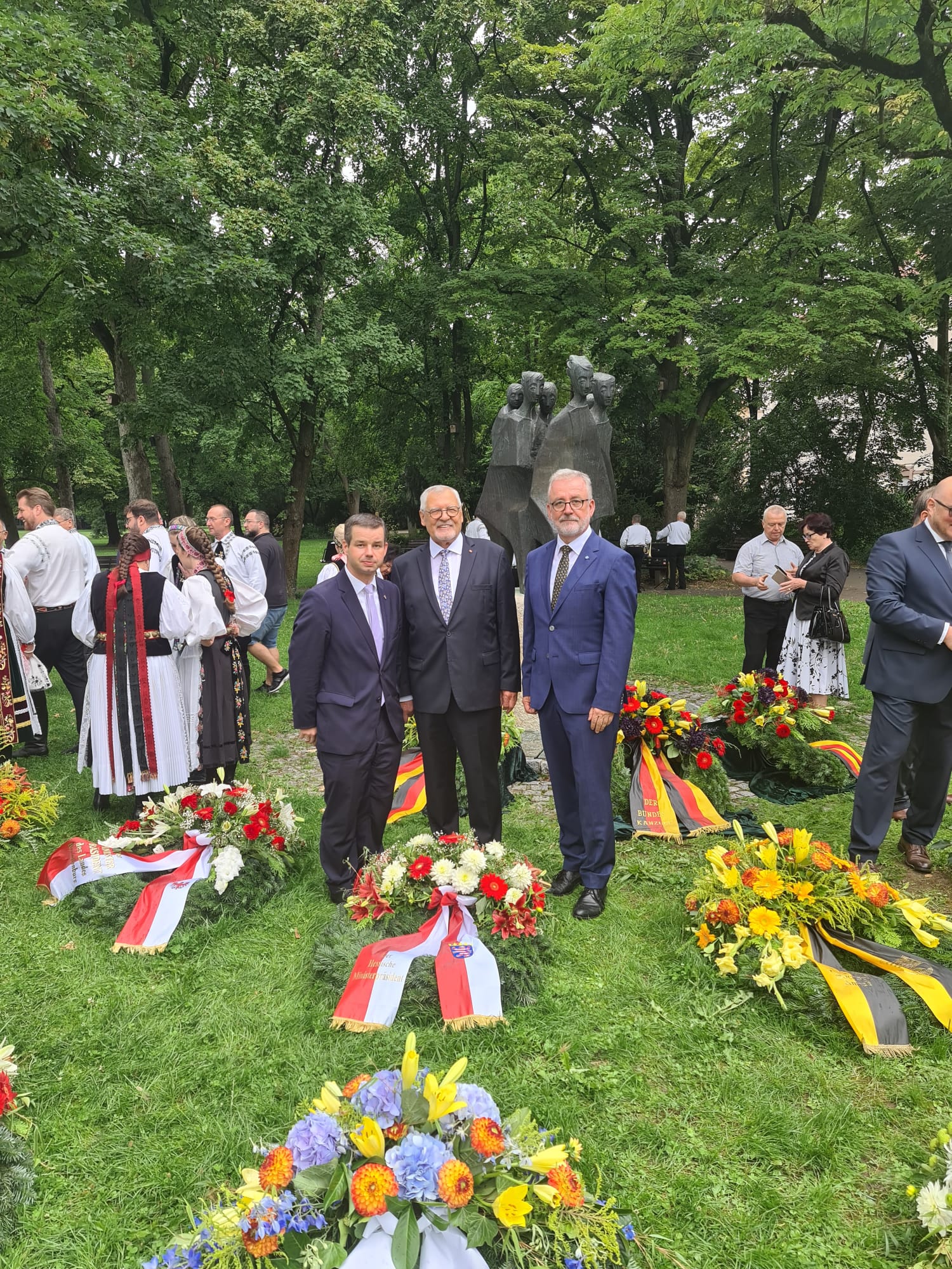 Im Gedenken an die Opfer von Flucht und Vertreibung legten die höchsten Staatsämter, die Bundesländer, Ministerien und Mitgliedsorganisationen des Bundes der Vertriebenen sowie die Arbeitsgemeinschaft deutscher Minderheiten in der FUEN (AGDM) Kränze am Vertriebenen-Denkmal im Kurpark Bad Cannstatt nieder. Für die Hessische Landesregierung übernahm dies der Landesbeauftragte Andreas Hofmeister.