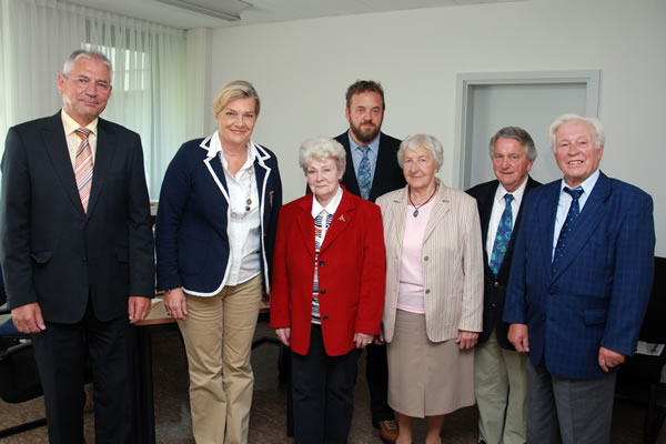 Foto: Der geschäftsführende Bundesvorstand der Landsmannschaft nach dem Gespräch mit der Landesbeauftragten von rechts: Karl Bauer, Pastor i.R. Georg Sichler, Hedi Kreisler, Dr. Martin Sprungala, Dr. Ursula Mechler, Landesbeauftragte Margarete Ziegler-RasDie Landesbeauftragte gab ihrer Freude Ausdruck, dass dieses Gespräch mit dem geschäftsführenden Bundesvorstand zustande gekommen sei, nachdem sie im letzten Jahr kurz nach ihrer Amtseinführung bereits ein Gespräch mit dem Bundessprecher Karl Bauer hatte. „Die Patenschaft mit der Landsmannschaft Weichsel-Warthe hat für das Land Hessen eine ganz besondere Bedeutung. Ich danke der Landsmannschaft auch im Namen von Herrn Staatsminister Banzer für die offene und partnerschaftliche Zusammenarbeit im Rahmen der Patenschaft mit dem Land Hessen. Gerne will ich mich auch in Zukunft für ihre Anliegen einsetzen und die Patenschaft weiter pflegen, zumal dies zu meinen Aufgaben als Landesbeauftragte gehört“, so Frau Ziegler-Raschdorf.