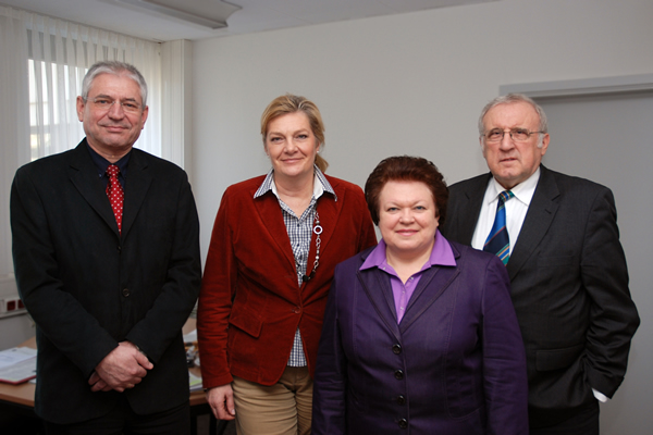 Foto: Nach dem Gespräch im Büro der Landesbeauftragten von rechts: Bundesvorsitzender Adolf Fetsch, Bundesvorstandsmitglied Rosa Emich, Landesbeauftragte Margarete Ziegler-Raschdorf und Büroleiter Georg Unkelbach.Bei dem intensiven Gedankenaustausch ging der Bundesvorsitzende Adolf Fetsch auf die Härtefälle im Spätaussiedleraufnahmeverfahren, die seit Jahren bestehenden Mängel bei der Anerkennung von Berufs- und Hochschulabschlüssen von Spätaussiedlern, die Fremdrentenregelung sowie auf die oftmals negative Darstellung der Deutschen aus Russland in den Medien ein. Er berichtete von einem Gespräch des Bundesvorstandes mit dem Beauftragten der Bundesregierung für Aussiedlerfragen und nationale Minderheiten, dem Parlamentarischen Staatssekretär Dr. Christoph Bergner, am 22. Februar 2010 im Bundesministerium des Innern.