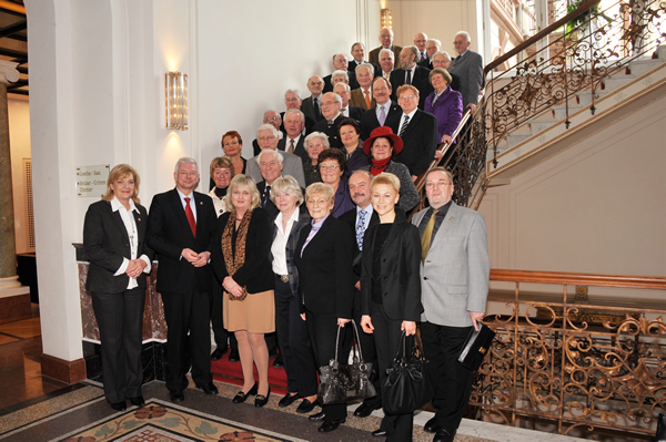 Foto: e.blatt | Der Ministerpräsident nach dem Neujahrsgespräch mit den Vertretern der Verbände und Landsmannschaften: Erste Reihe v.l.: Landesbeauftragte Margarete Ziegler-Raschdorf, Ministerpräsident Roland Koch, Staatssekretärin Petra Müller-Klepper, LMinisterpräsident Roland Koch begrüßte neben den Teilnehmerinnen und Teilnehmern auf Seiten der Landesregierung die Vertreter der Heimatvertriebenen und Spätaussiedler und hier insbesondere den BdV-Landesvorsitzenden Alfred Herold. Er nannte es eine gute und sorgfältig gepflegte Tradition seit einem Jahrzehnt, sich zu Beginn des Jahres in diesem Kreis zu treffen. Das stabile finanzielle Niveau werde diesen Politikbereich auch in Zukunft prägen. Dies gelte für die Kulturarbeit der Heimatvertriebenen als auch für die intensive Zusammenarbeit mit den Russlanddeutschen.