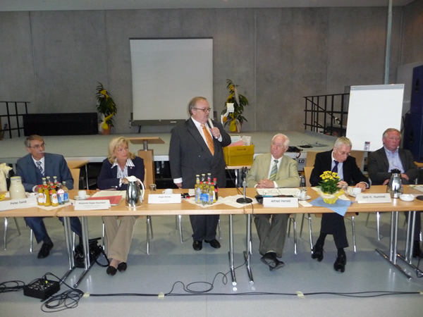 Staatsminister Jürgen Banzer (Mitte) bei seinem Grußwort vor dem Landesvertriebenenbeirat mit der Landesbeauftragten Margarete Ziegler-Raschdorf (2.v.l.) und dem Beiratsvorsitzenden Alfred Herold (3.v.r.)„Für die Landesregierung sage ich zu, in der bewährten Weise eng mit den Verbänden der Heimatvertriebenen und Spätaussiedler zusammenzuarbeiten und kann versprechen, dass die kulturelle Arbeit weitergeht“, erklärte Roland Koch. Bezüglich der Heimatsammlungen und Heimatstuben sei man ebenso auf die Verbände angewiesen wie beim Thema Schulunterricht zu Flucht und Vertreibung. Gleichfalls brauche man die Unterstützung bei der Integration der Spätaussiedler. Auch habe er persönlich großen Respekt davor, wie Heimatvertriebene 20 Jahre nach Wegfall des Eisernen Vorhangs den Weg zurück in die alte Heimat gefunden und durch Unterstützung der dort lebenden Menschen einen Beitrag zur Verständigung und Erhöhung der Reputation von uns Deutschen geleistet haben. Diese grenzübergreifende Arbeit sei sehr wichtig und müsse auch weiter finanziell gefördert werden.