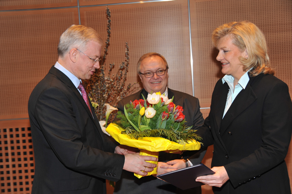 Foto: e.blatt | Ministerpräsident Roland Koch überreichte bei der Amtseinführung die Ernennungspapiere und einen Blumenstrauß an Margarete Ziegler-Raschdorf (rechts). In der Mitte Staatsminister Jürgen Banzer.Während der Feierstunde in der Staatskanzlei erläuterte die Landesbeauftragte, dass sie seit 1989 auf Stadt- und Kreisebene in Fulda in der Kommunalpolitik aktiv sei und von 2004 bis 2008 dem Hessischen Landtag angehört habe. Dort war sie Vorsitzende des Rechtsausschusses, Mitglied im Sozial- und Petitionsausschuss und in der Härtefallkommission sowie Mitglied im Unterausschuss für Heimatvertriebene, Aussiedler, Flüchtlinge und Wiedergutmachung. Gerade die Arbeit in diesem Unterausschuss und nicht zuletzt die Mitwirkung bei der Integrationsarbeit für Spätaussiedler in Fulda bilde eine wichtige Grundlage für das Amt der Landesbeauftragten für Heimatvertriebene und Spätaussiedler. „Die Geschichte meiner Familie und meine schlesischen Wurzeln sind jedoch das Hauptmotiv und auch gefühlte Verpflichtung für mich, die Aufgabe der Landesbeauftragten zu übernehmen“, so die Landesbeauftragte.