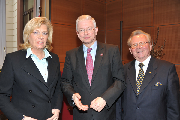 Foto(e. blatt): Ministerpräsident Roland Koch mit der neuen Landesbeauftragten Margarete Ziegler-Raschdorf (links) und dem bisherigen Landesbeauftragten Rudolf Friedrich (rechts).Der Ministerpräsident erinnerte daran, dass er Rudolf Friedrich im Jahre 1999 als ersten Landesbeauftragten in Hessen berufen habe, was auch Signalwirkung für andere Bundesländer gehabt habe. „Rudolf Friedrich war 29 Jahre lang Landtagsabgeordneter. Und 10 Jahre hat er das ehrenamtliche Amt des Landesbeauftragten der Hessischen Landesregierung für Heimatvertriebene und Spätaussiedler in vorbildlicher Weise ausgeübt. Mit seiner ruhigen Art und seiner Persönlichkeit hat er als der erste, der in diese Funktion berufen wurde, das Thema Heimatvertriebene und Spätaussiedler zu einem selbstverständlichen Politikbereich der Landesregierung gemacht, diese Gruppen sind wichtige Teile unserer Gesellschaft“, so der Ministerpräsident. Durch die hervorragende Arbeit des Landesbeauftragten sei die Integration der Spätaussiedler in Hessen nachhaltig gefördert und eine gute Integrationsarbeit geleistet worden. Die Hessische Landesregierung schätze die Arbeit der Landsmannschaften und werde das Engagement der Spätaussiedlerorganisationen auch zukünftig unterstützen. Koch dankte Friedrich für seine engagierte Arbeit zum Wohl der Heimatvertriebenen und Spätaussiedler und des Landes Hessen sowie für die vertrauensvolle Zusammenarbeit in all den Jahren.