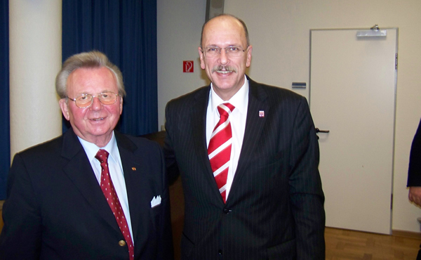 Foto: Landesbeauftragter Friedrich (links) mit dem Festredner beim 61. BdV-Landesverbandstag in Wiesbaden, dem Chef der Staatskanzlei, Staatsminister Stefan GrüttnerDer Landesbeauftragte erinnerte an die Lehrerhandreichung „Umsiedlung, Flucht, Vertreibung“, die den Lehrkräften für den Geschichtsunterricht zur Verfügung gestellt werden konnte. Der Landesvertriebenenbeirat sei seit 1999 wieder aufgewertet worden, was an der Teilnahme der Ministerin bzw. des Staatssekretärs zu ersehen sei. Seit dem Jahr 2000 finde das Neujahrsgespräch des Ministerpräsidenten mit den Vertretern der Verbände und Landsmannschaften als offener Gedankenaustausch statt. Beim Hessentag sei der „Tag der Vertriebenen“ nicht mehr wegzudenken. Ebenso die zentrale landesweite Veranstaltung zum „ Tag der Heimat“ im Biebricher Schloss in Wiesbaden.